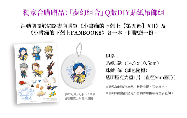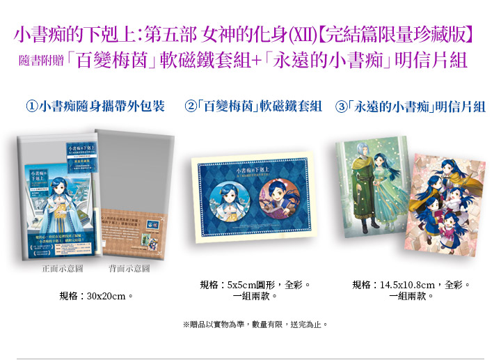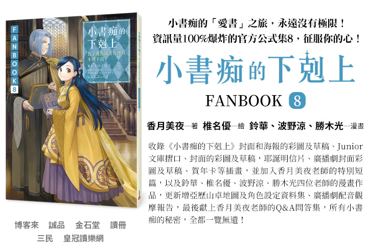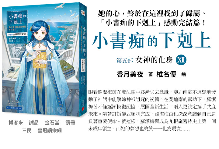 為了拯救羅潔梅茵,斐迪南不顧後果地想方設法,讓羅潔梅茵身上的諸神之力耗盡,為此他必須將覆蓋貴族院的古代魔法,改成大規模的治癒魔法。但這樣的做法只有一次機會,也會讓羅潔梅茵無限接近死亡。究竟,斐迪南是否能成功拯救羅潔梅茵?敬請期待小書痴的最後一集! |