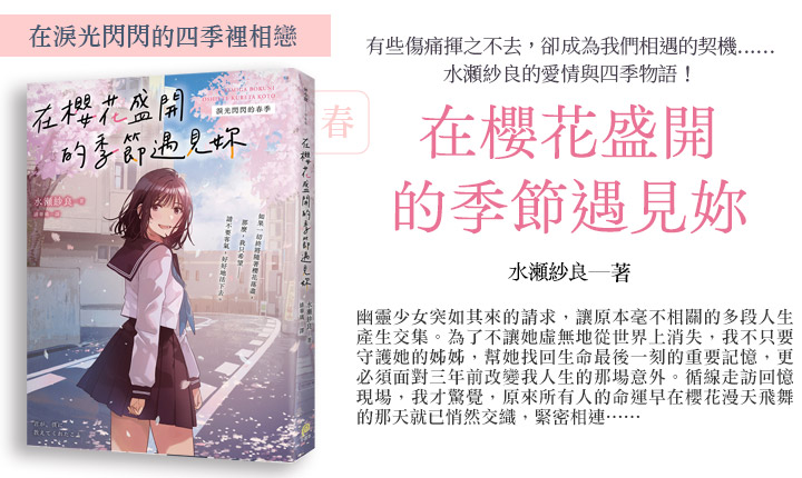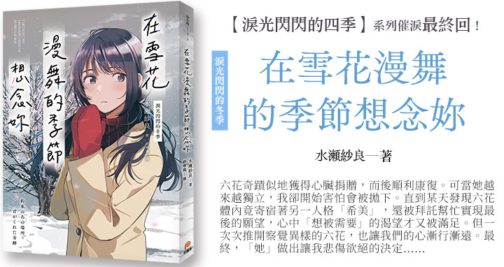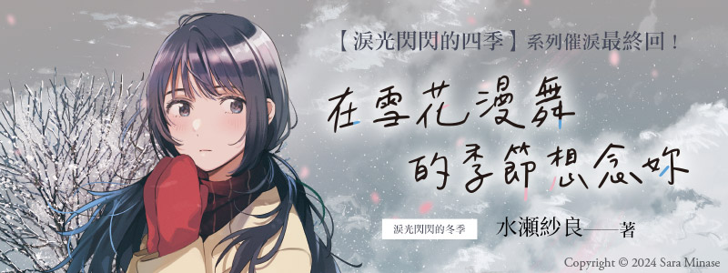 今年冬天,純愛小說家水瀬紗良【淚光閃閃的四季】系列催淚最終回!在細雪紛飛,春日將近的季節,沒能說出口的思念終於在「約定的地方」化作言語。所有人的心意交織如花般盛開,奇蹟也隨之綻放——