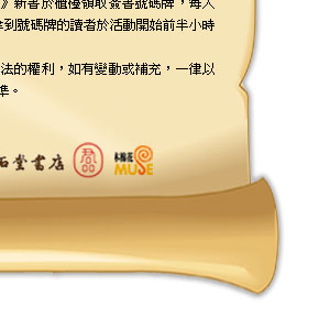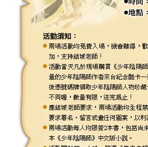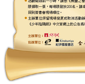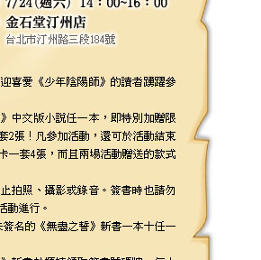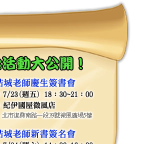 活動詳情、參加辦法及細節請見【陰陽生手札】。如果你有任何疑問,例如:幾點去排隊領號碼牌?限量贈品怎麼送?可以簽什麼書?(新書《無盡之誓》是一定要的)點選討論區的「結城老師訪台活動大公開!」,小網管已經先做出詳細的答覆了!