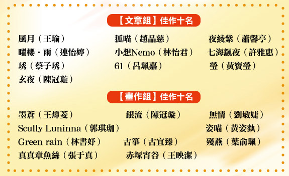 這次的活動,文章組和畫作組剛剛好都有三十篇來稿,真是圓滿啊!而作品則各有千秋,無論是寫作方式、內容,或繪畫主題、用色,都看得出參加的陰陽生們花了很多心思,其中有些真是令眾評審佩服得五體投地,各位陰陽生,你們都太多才多藝了啦!到底有多麼多才多藝呢?陰陽寮將在整理之後,將佳作及優勝作品放在官網上請大家欣賞,到時各位就知道囉!同時也會刊登在十月份將出的《陰陽寮時報》第六期,敬請期待∼