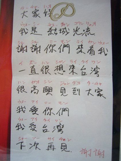 | 在23日晚上紀伊國屋微風店、24日下午金石堂書店汀洲店的兩個會場,老師真的很清楚地說出了這幾句對讀者的問候,雖然當時多少需要翻譯一下,但我們還是為她鼓勵鼓勵!上方左圖就是老師連作夢也在記的對中文版少陰迷們的問候(這張老師親手騰寫的紙稿在金石堂那場簽書會上,最後以有獎徵答的方式送給一位讀者囉,請當成傳家之寶吧!)